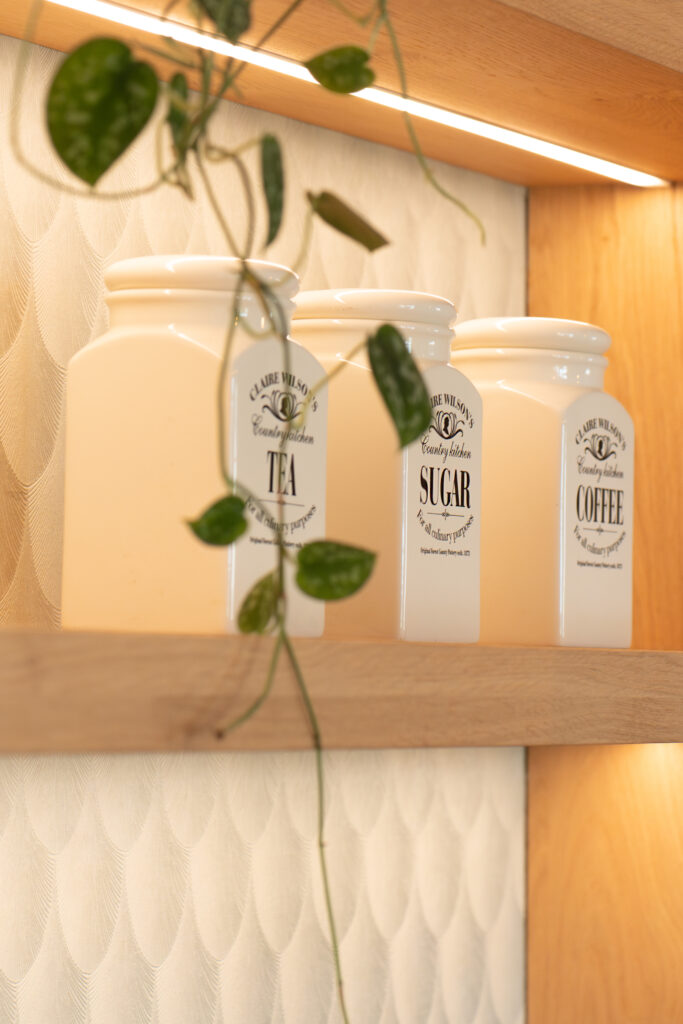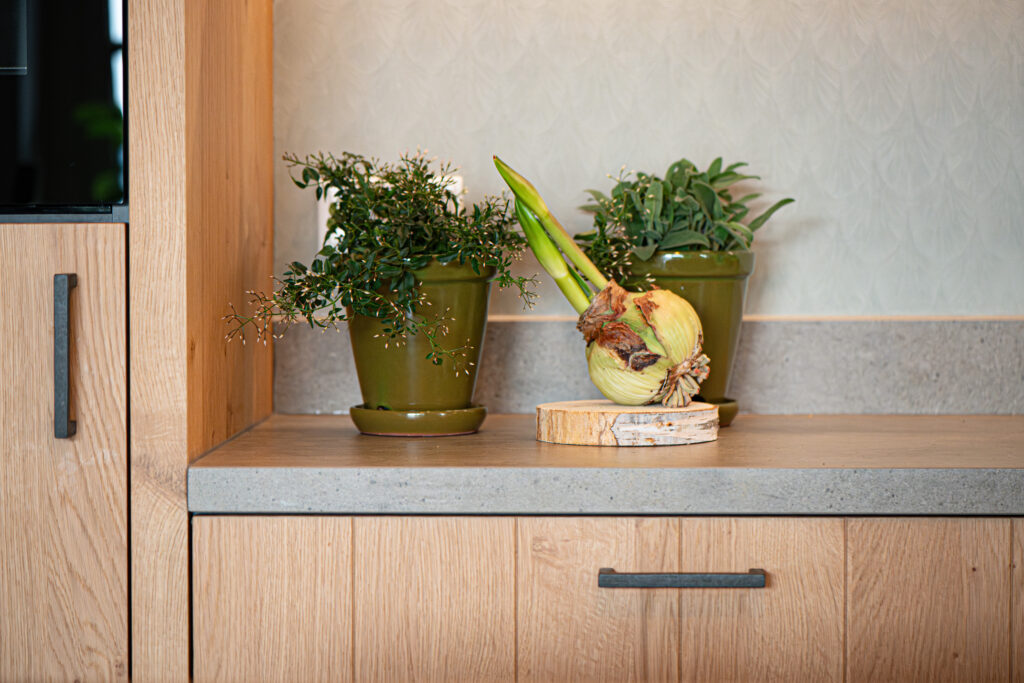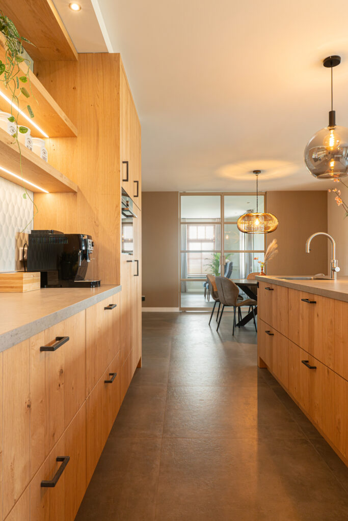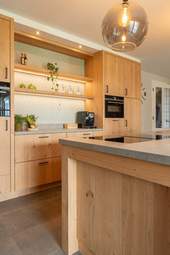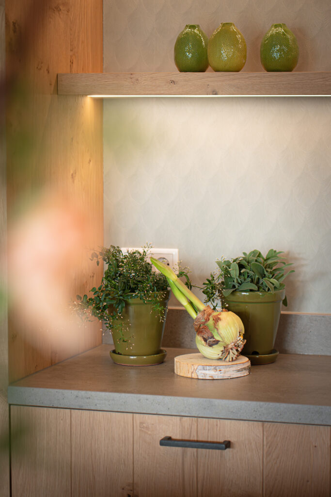 Een speels detail vormen de open planken boven het werkblad, die met geïntegreerde sfeerverlichting extra warmte en karakter aan de keuken toevoegen. Hier is ruimte voor verse kruiden, kookboeken of mooie accessoires, waarmee de bewoners het helemaal naar eigen smaak kunnen maken.