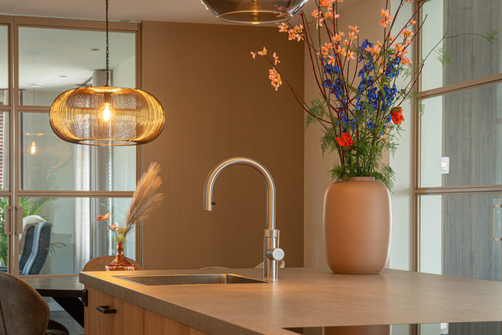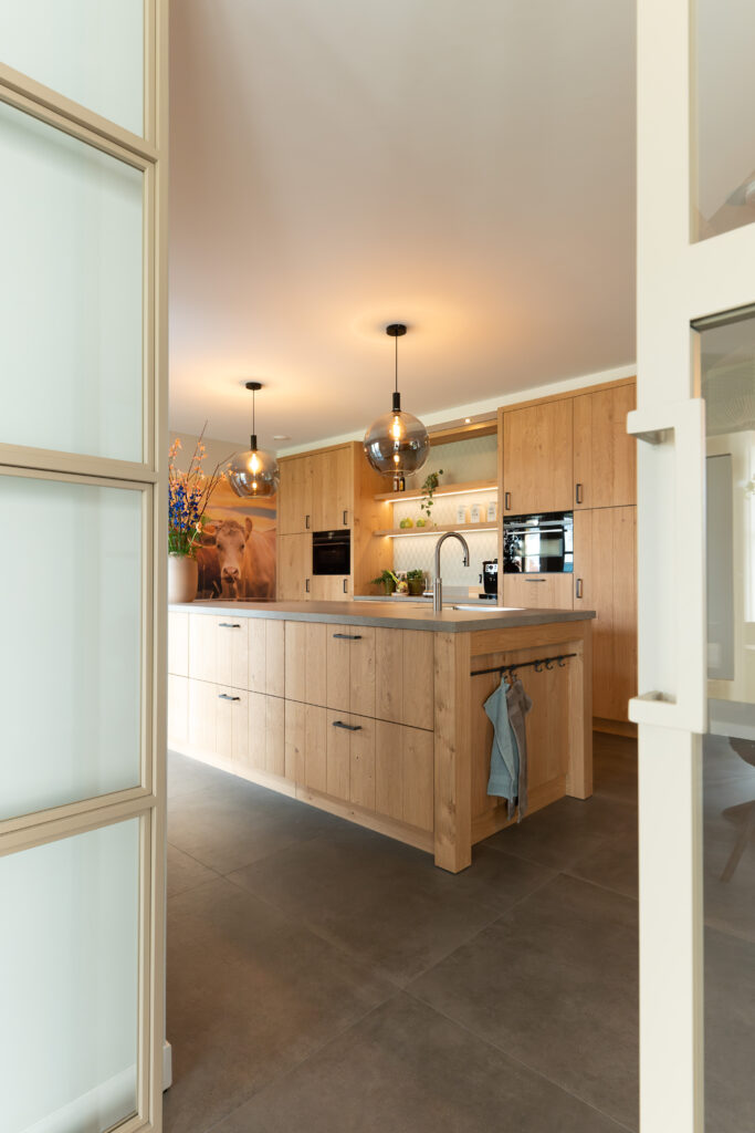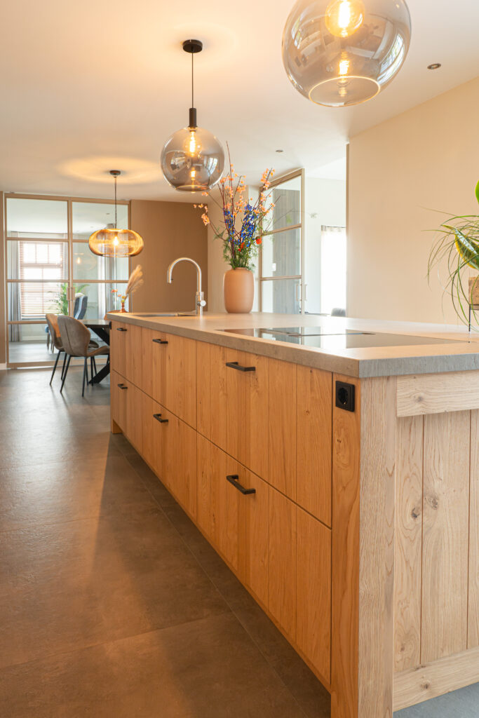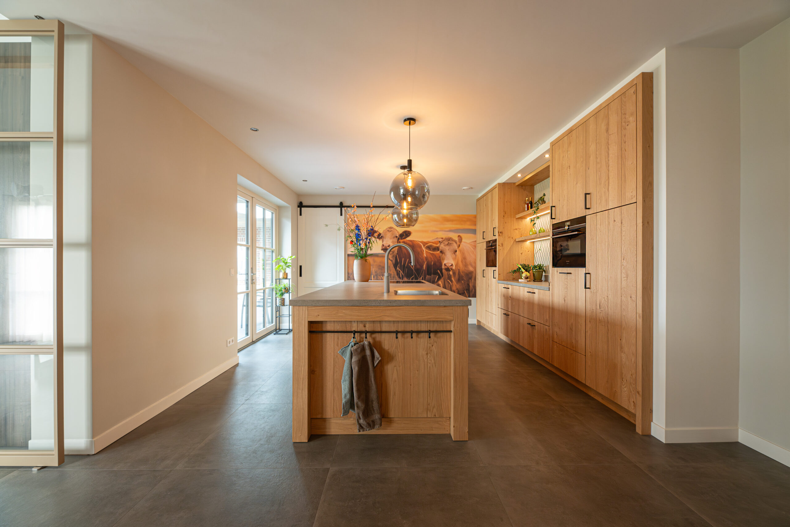 De ruime opstelling, gecombineerd met een rustig kleurenpalet en natuurlijke materialen, maakt deze keuken tot een uitnodigende plek waar koken, gezelligheid en stijl hand in hand gaan. De grote schuifdeur versterkt de sfeer en maakt de ruimte helemaal af. Kortom: een keuken die zowel praktisch als sfeervol is en waar je elke dag met plezier in werkt en leeft.