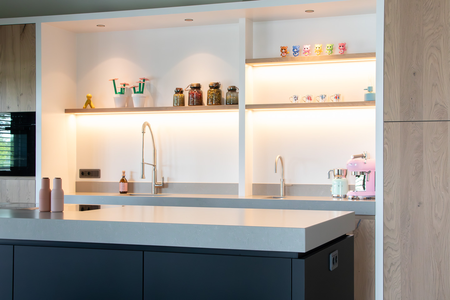 Het contrast tussen het matte zwart en het warme houtfineer geeft de keuken een tijdloze uitstraling. De matzwarte kasten creëren een strakke, moderne look, terwijl het houtfineer warmte en textuur toevoegt, waardoor er een perfecte balans ontstaat tussen moderniteit en gezelligheid.